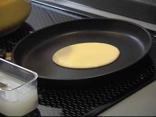 Stellen Sie einen dünnen Crêpesteig her. Verwenden Sie eine Teflonpfanne mit ca. 24 cm Ø