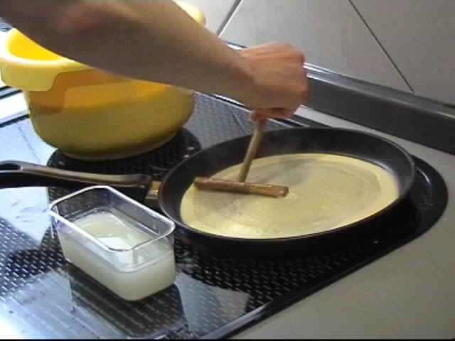 Drehen Sie den Teig zügig in der Pfanne auseinander, um ein festbacken von kleinen Teigklumpen am Teigrechen zu verhindern. Versuchen Sie den Teig möglichst gleichmäßig zu verteilen. Sollten Sie einmal den Teig am Rand verlieren, heben Sie den Teigrechen hoch und setzen neu an. |